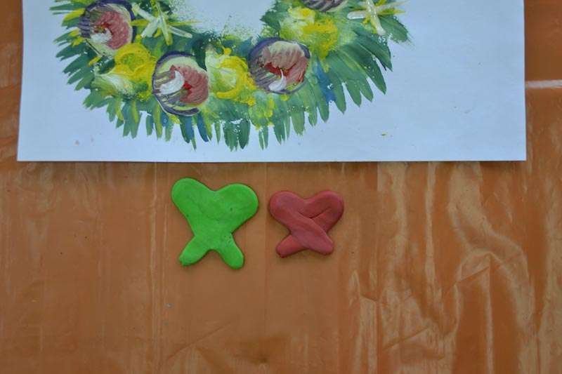 9. Прикрепляем наш пластилиновый бант на новогодний венок.