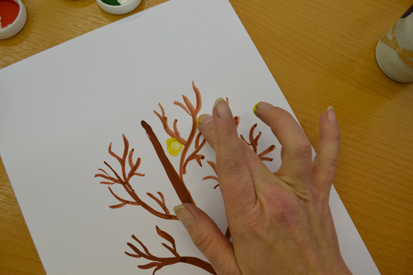 2. Приготовьте краски желтую, красную и зеленую. Чтобы ребенку было удобно макать пальчик в краску, используйте или крышку от баночки с краской или любую другую удобную ёмкость. Окуните пальчик в краску и приложите к веткам дерева, сделав отпечаток.