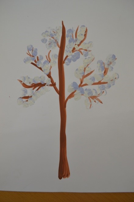 7. А теперь в белую краску добавьте немного синий, чтобы получилась голубая краска. Макнем пальчик в голубую краску и сделаем отпечаток на веточке, так же, как и в предыдущем уроке. Можно делать отпечатки попеременно, то белой краской, то голубой.