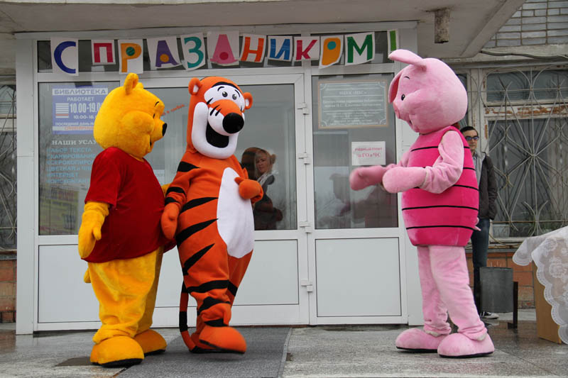 На улице гостей встречали ростовые куклы, ведущий – зазывала.
