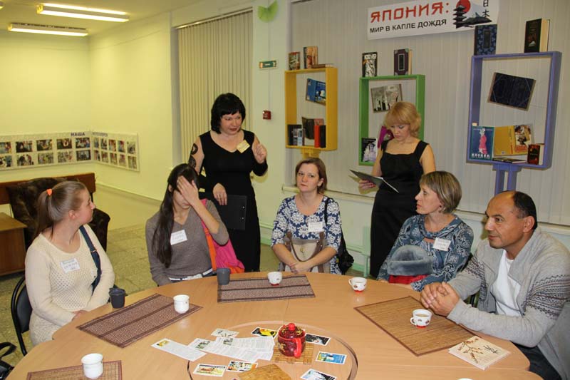 Также в течение вечера гости могли посетить чайный стол по-японски с изысканной подачей фьюжн-чая через неподражаемый вкус слияния стилей, смешения жанров, сплава литературы и совсем иных сфер человеческой жизни. Книги японских авторов ведут от одного интереса к другому, рождая новое увлечение, незаметно перенося читателя в иную область познания. За чайным столом рассказывали о достопримечательностях Японии, обычаях, кухне, особенностях чайных церемоний. Здесь же гости могли принять участие в конкурсе и написать свое японское трехстишие – хайку, в котором отразилось отношение к происходящему.