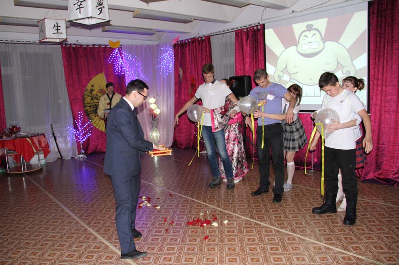 А вот в конкурсе «Япона мама» участникам необходимо было продемонстрировать ловкость владения палочками. С помощью них необходимо было собрать как можно больше лепестков роз. Усложнялось задание еще и тем, что участникам необходимо было это делать в позе сумоистов. Победителю конкурса вручен приз – расписные японские палочки. В завершении конкурса все участники получили лепестки роз и осыпали ими всех дам в зале.